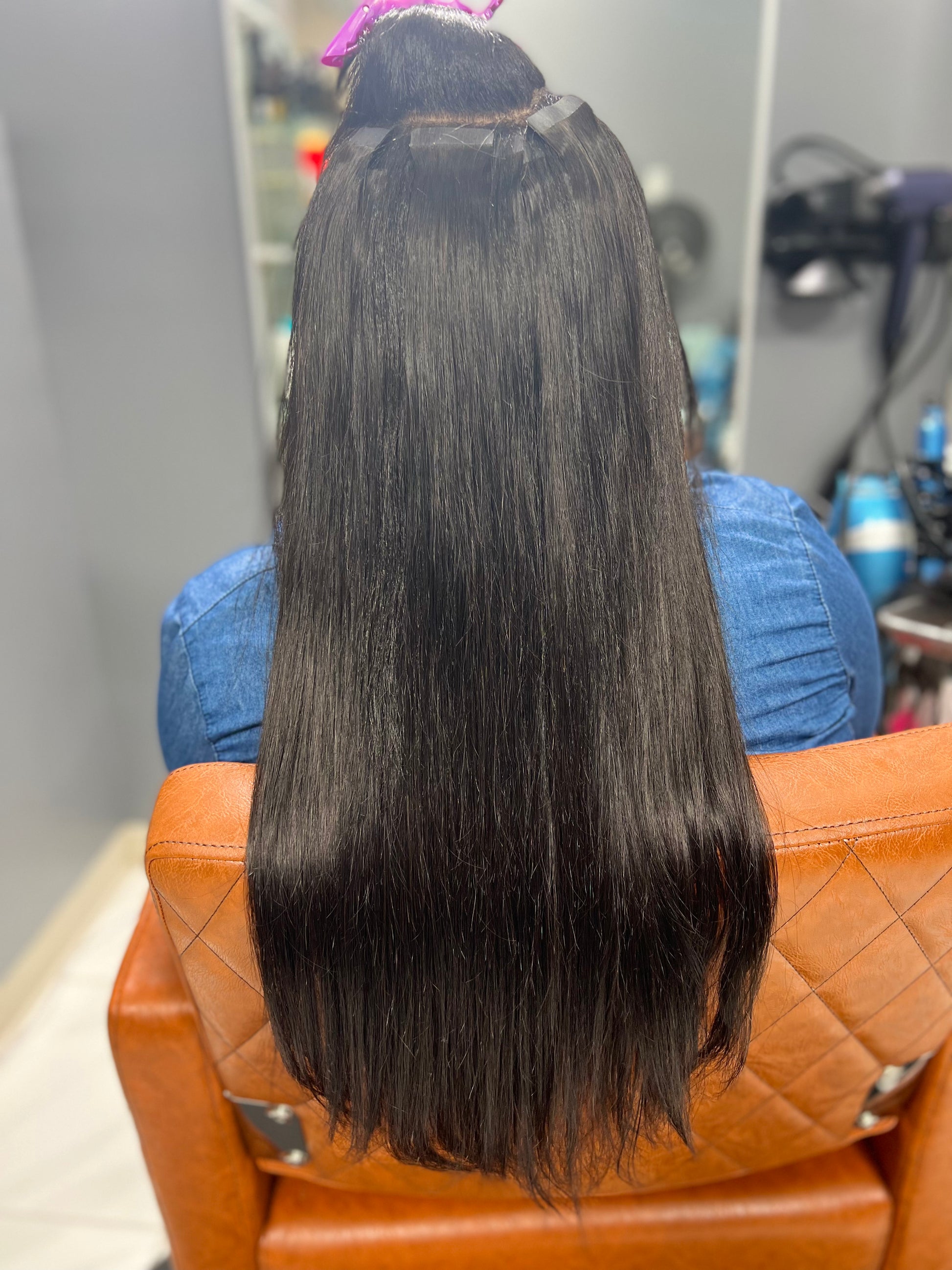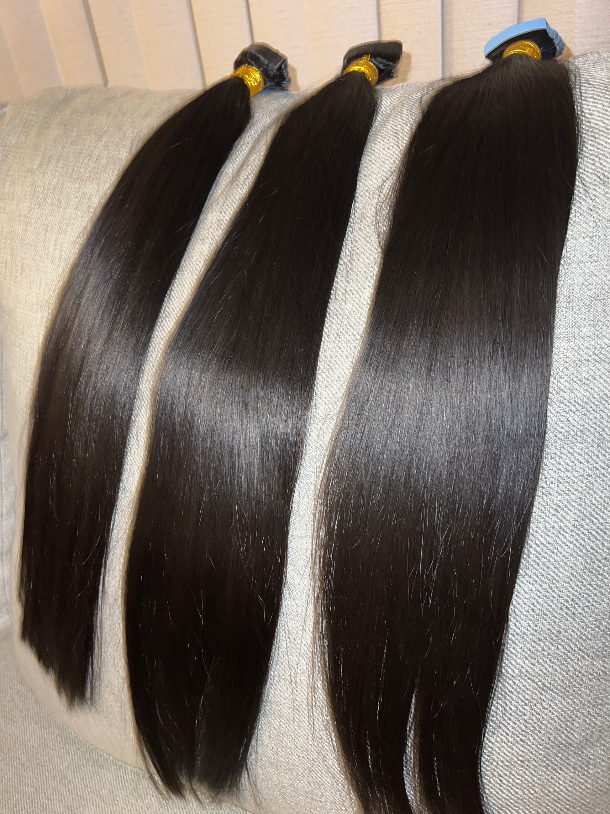 Our Sleek Straight Tape Ins are professional-quality hair extensions made from Brazilian straight hair. With a smooth and natural look, they seamlessly blend into your own hair for a flawless finish. Get the long, straight locks you've always wanted with these easy-to-use tape ins.Straight extensions
